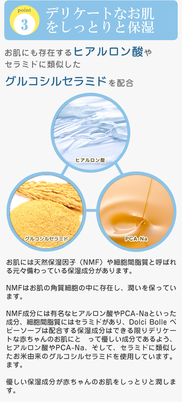 元々お肌の皮膚組織内に存在するセラミドと類似成分であるグルコシルセラミド(※保湿)やヒアルロン酸、PCA-Naといった保湿成分配合により赤ちゃんのお肌に潤いを残しながら、全身を優しく洗い上げます。